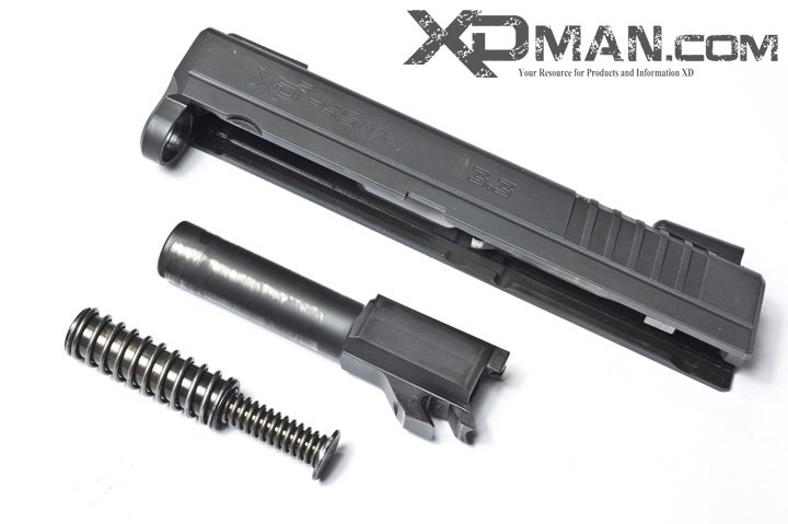 The XDS slide assembly shown field stripped, the slide is on top the barrel in the middle and recoil assembly on bottom.